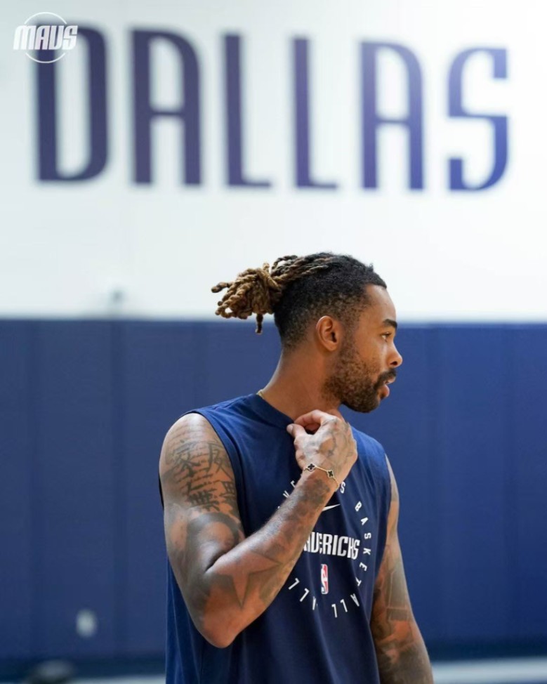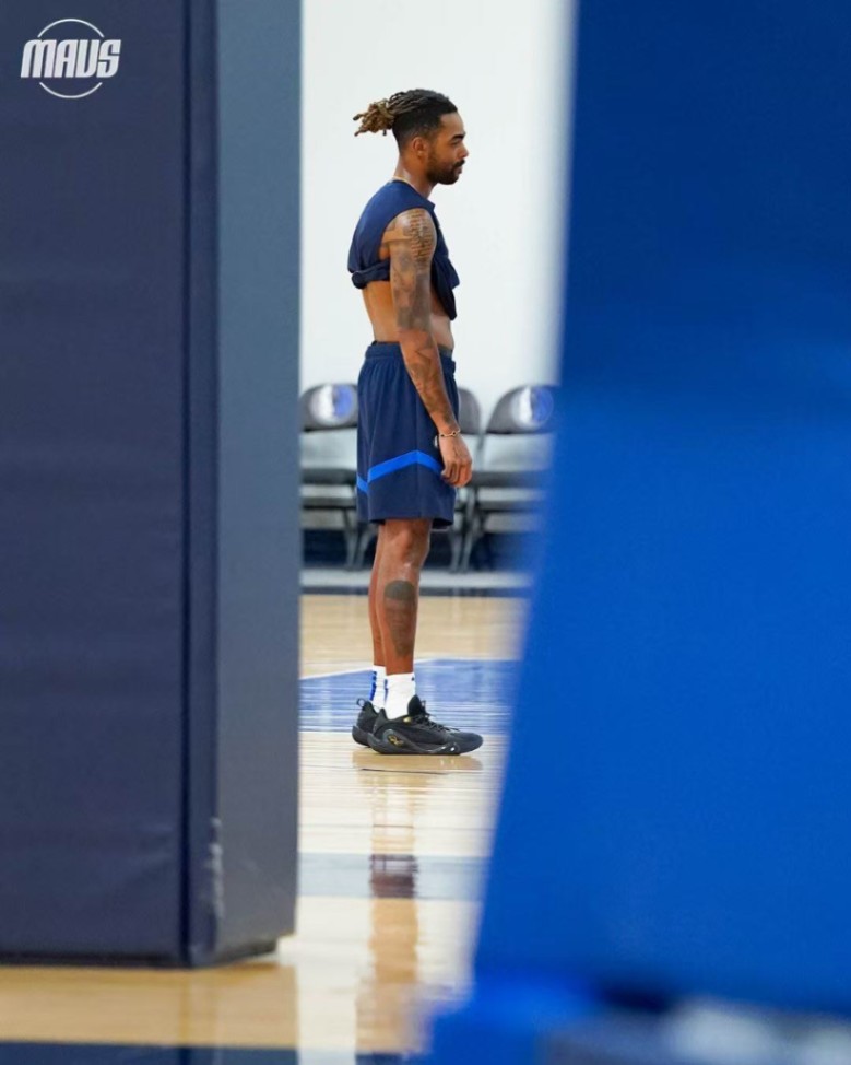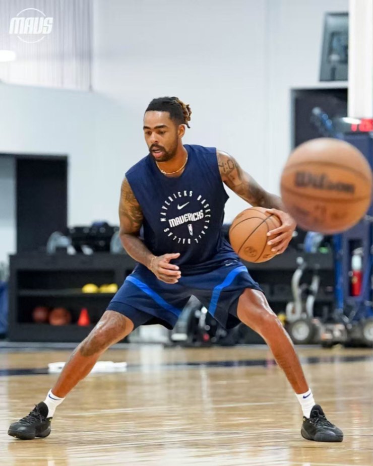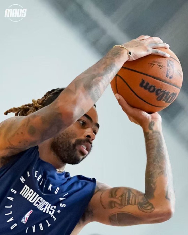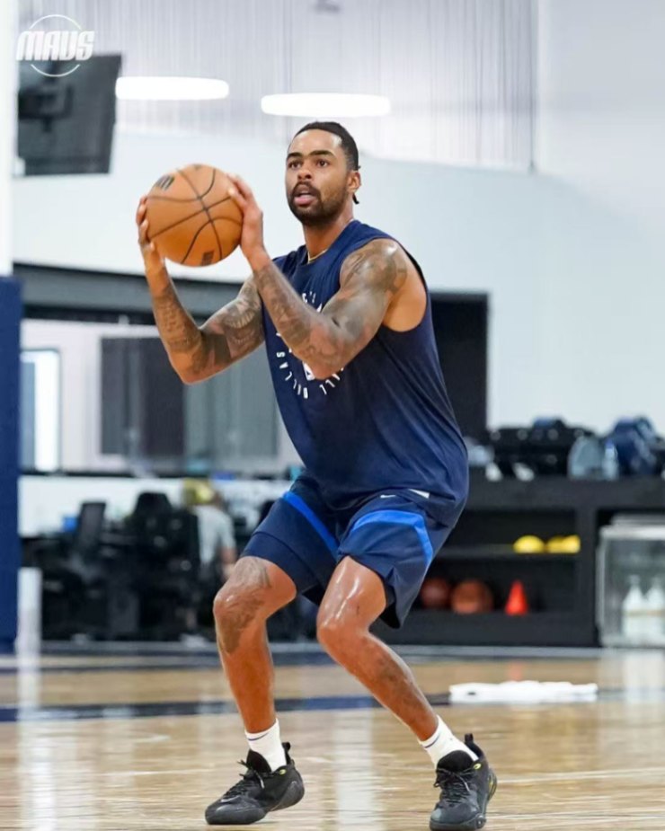 達拉斯獨行俠官方曬出丹吉洛·拉塞爾在球隊訓練館身穿獨行俠訓練服訓練照,並附文:DALLAS DLO