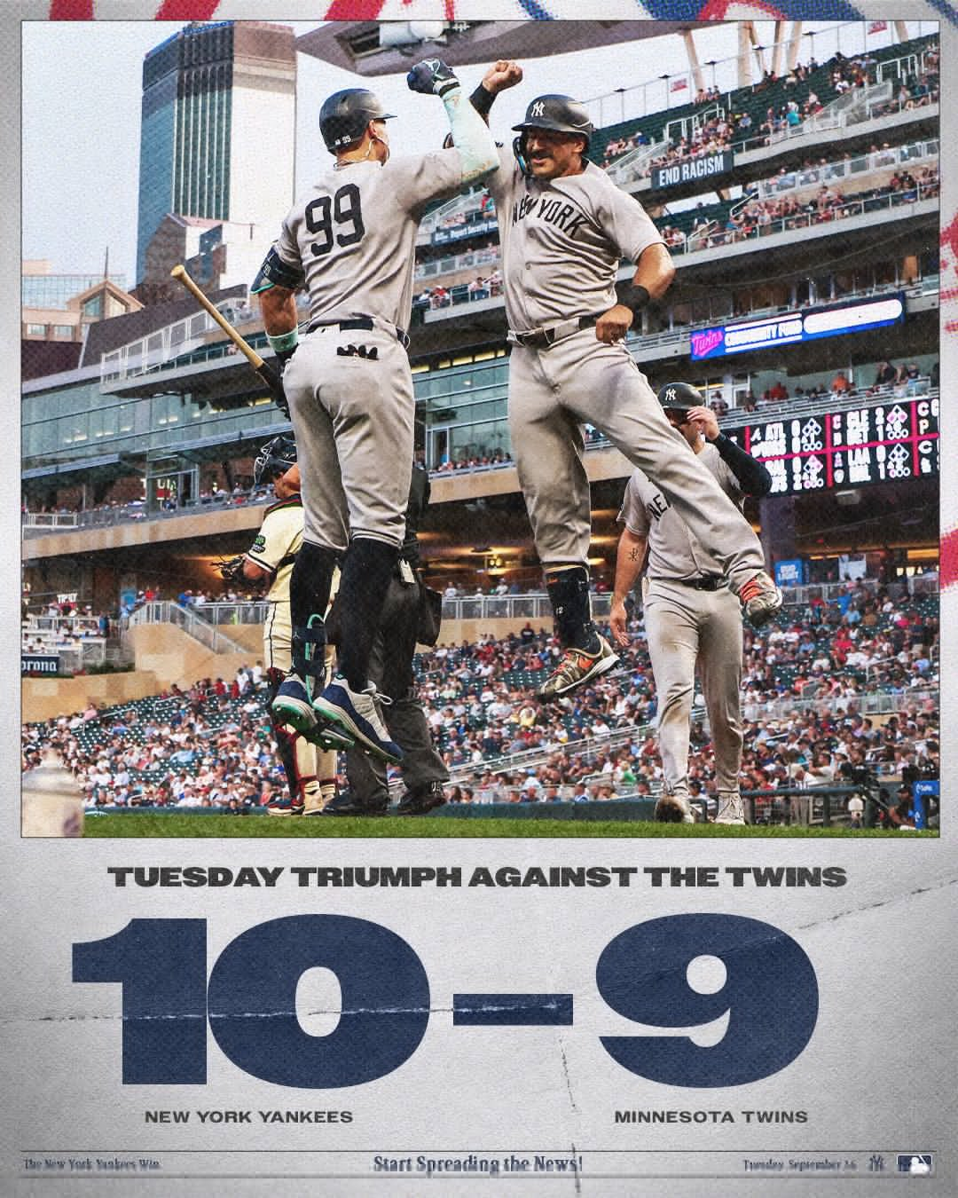 紐約洋基今日作客雙城,前四局打完就取得10比1的大幅領先。然而先發投手4.2局失4分退場後,第六局牛棚投手Yarbrough登板0.1局就失4分。第九局終結者Bednar登板救援再被敲一發陽春炮,被雙城追至一分差最終10比9驚險關門。
