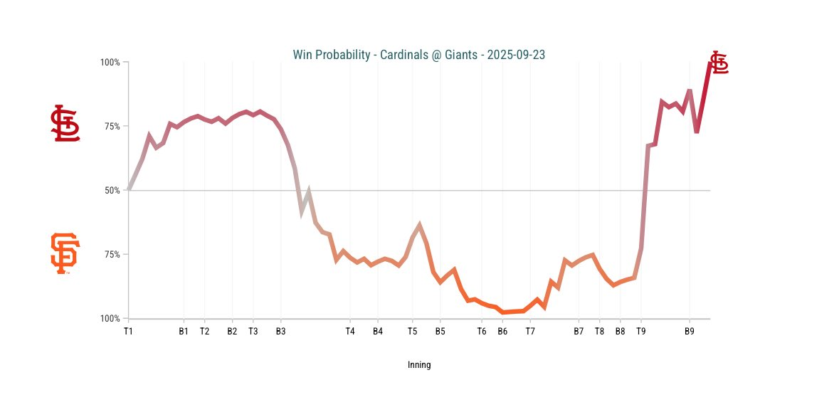 舊金山巨人今主場推出王牌Logan Webb迎戰紅雀持續拼戰季後賽,雖然首局就失三分但隨後穩定下來六局失三分優質先發。同時打線也拼盡全力完成逆轉六局打完8比3五分領先。然而牛棚最後三局失6分遭到逆轉,最終8比9近六戰吞下第五敗,在之前僅差1.5場勝差的機會下,正式無緣本季季後賽。