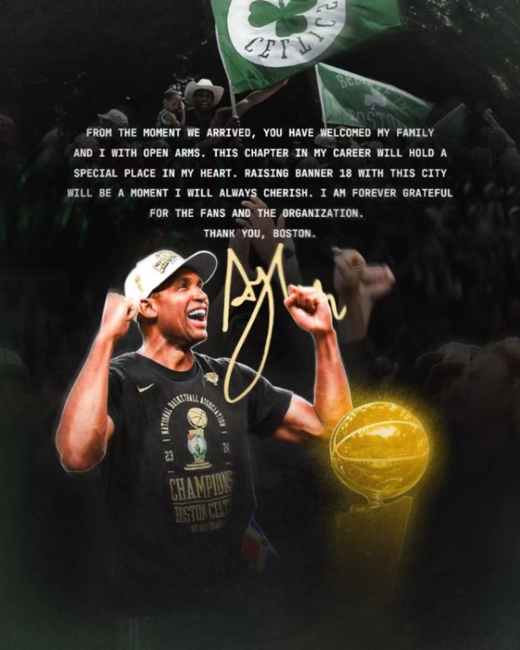 他寫道:“從我初來乍到,你們就張開手臂歡迎我和我的家人,我生涯的這一篇章將在心中佔據特殊位置。與這座城市一同升起的第18面冠軍旗幟,將是我永遠珍惜的時刻。我對塞爾蒂克球迷和管理層永懷感激。”