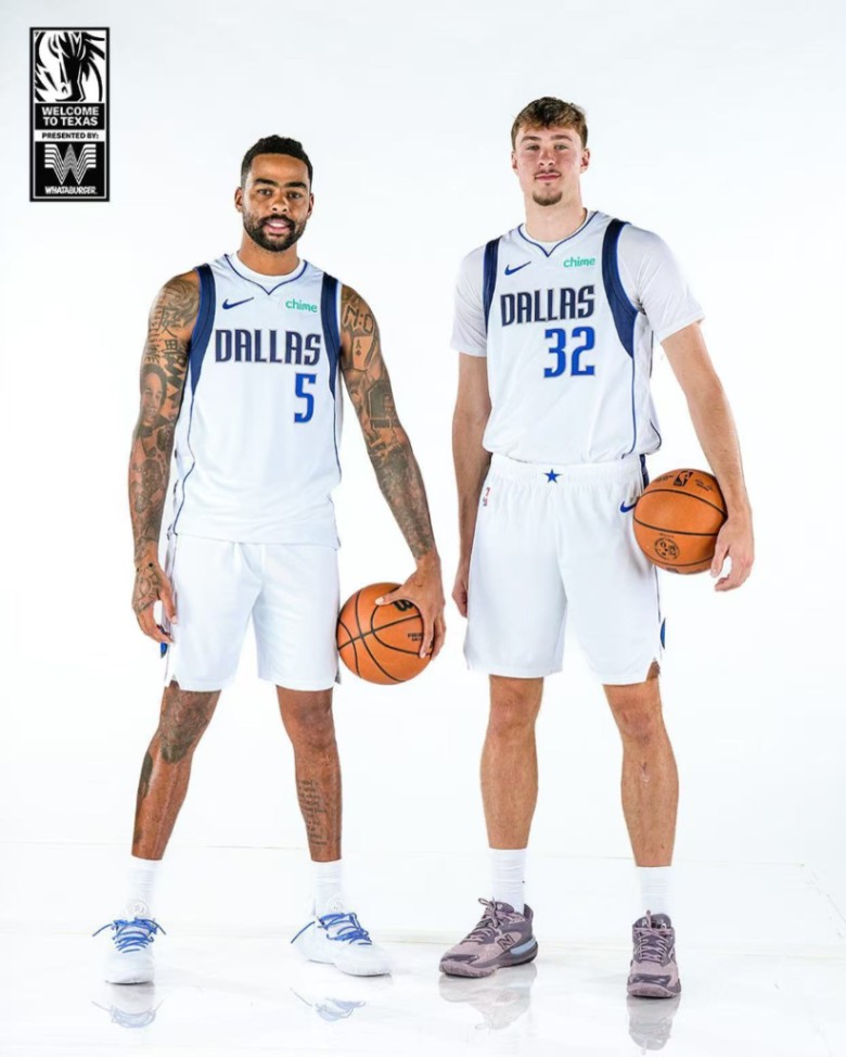 獨行俠官方曬出D'Angelo Russell和狀元Cooper Flagg的媒體日合照並配文: