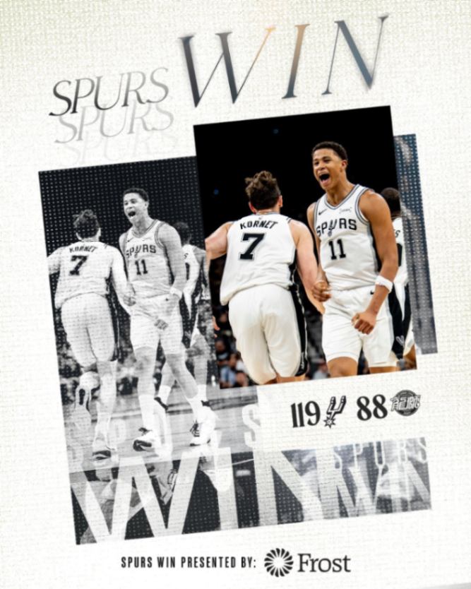 馬刺方面,Wembanyama出戰不足17分鐘,交出9分10籃板7助攻3蓋帽。Keldon Johnson 8中6得到16分,Luke Kornet 6投全中拿下16分。