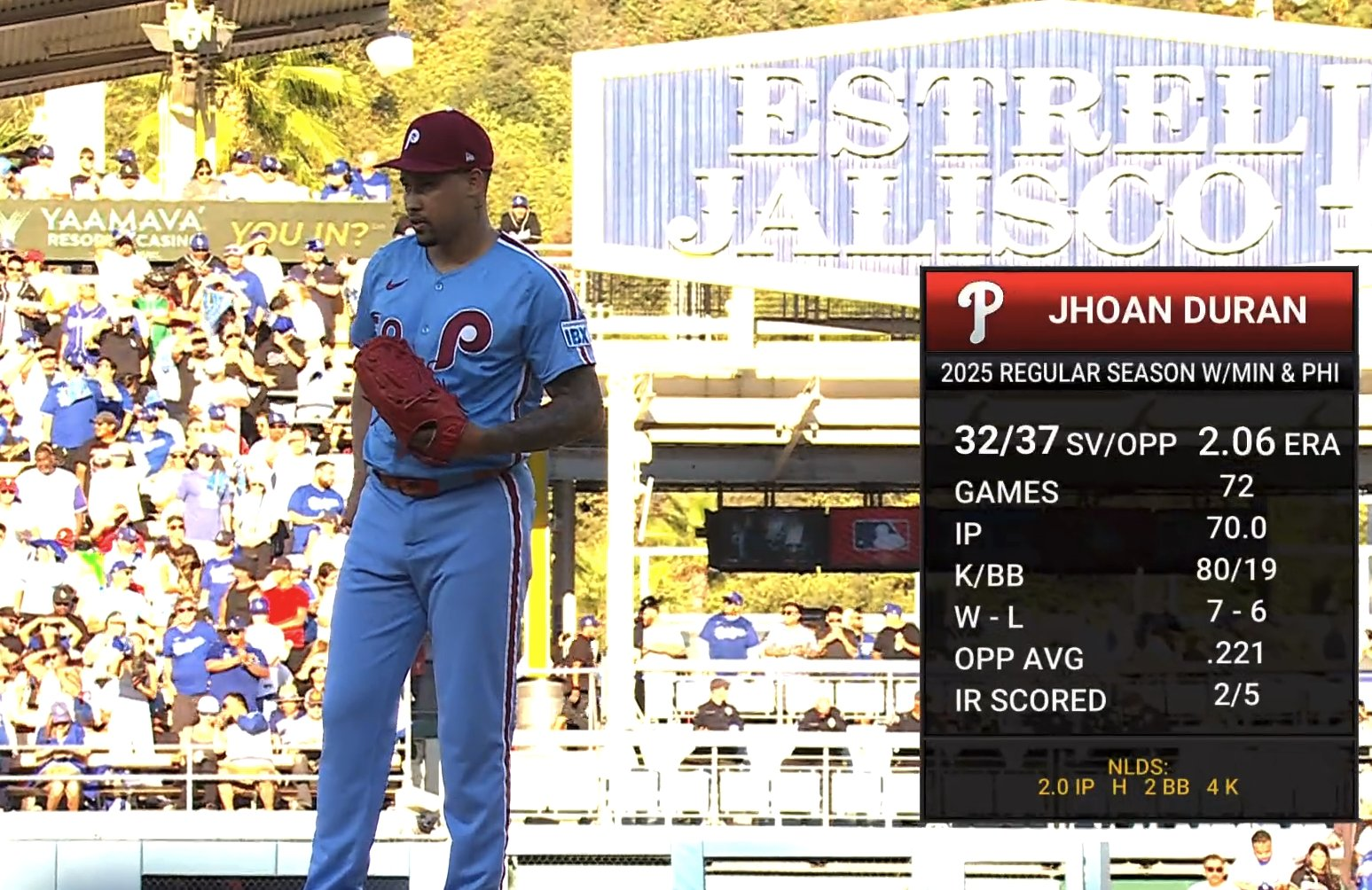 費城人總教練Thomson在第七局面對大谷翔平選擇敬遠保送策略,形成兩出局滿壘的局面。然而終結者Duran面對Betts投出四壞擠回追平分。賽後Thomson受訪表示,滿壘策略沒有感到擔心。這是Duran生涯第一次在滿壘情況投出四壞保送,以他的能力來看這是意料之外。