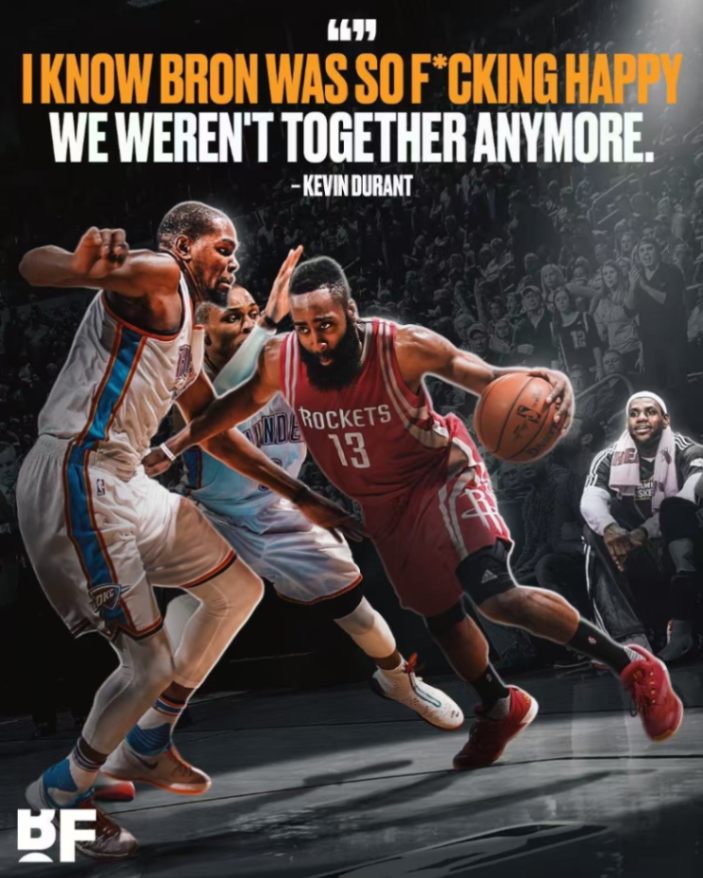 "真正讓我火大的是,LeBron James、D-Wade和那麼多NBA球員發推說什麼'恭喜我兄弟James Harden…他必將大殺四方'……我清楚LeBron他媽的高興壞了,因為我們終於散夥了——當初我們可讓他們吃不消。"