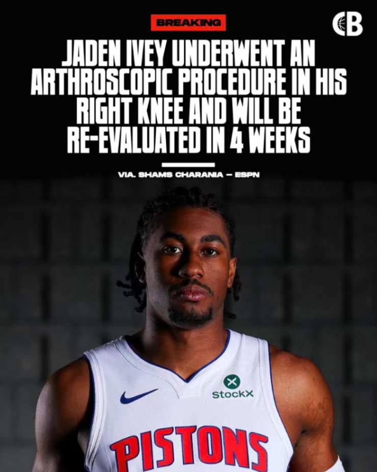 底特律活塞隊後衛Jaden Ivey今日接受關節鏡手術以緩解右膝不適,他將在四周後接受重新評估。