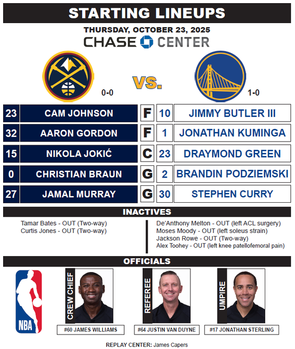 今日NBA焦點戰,金塊對陣勇士,賽前兩隊首發名單公佈。