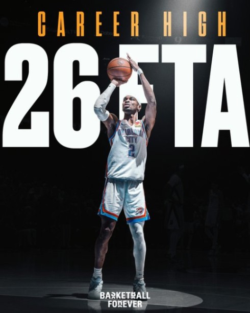 整場比賽,SGA共計在罰球線上出手26次,創造個人生涯單場罰球數新紀錄。而本賽季前兩場比賽合計,他罰球40次,命中33球,罰球得分佔個人總得分的36.7%。