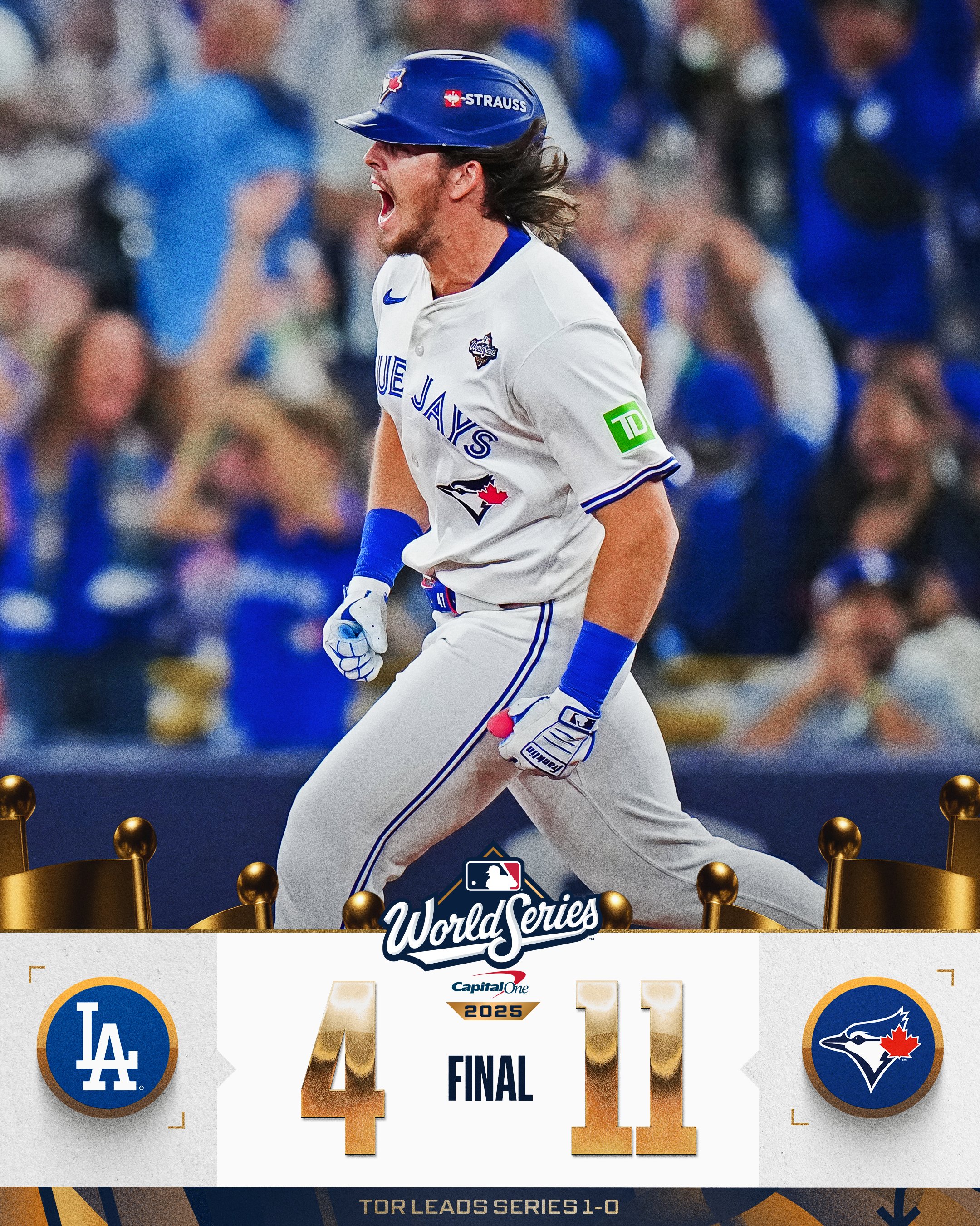 世界大賽G1於今(25日)在多倫多Rogers Centre點燃戰火,主場的藍鳥隊火力全開,全隊狂敲14支安打,靠著Barger關鍵滿貫砲與Kirk的兩分彈,最終以11比4大勝洛杉磯道奇,率先取得系列賽開門紅。即使大谷翔平敲出個人生涯在世界大賽的首轟,也難以挽回戰局。