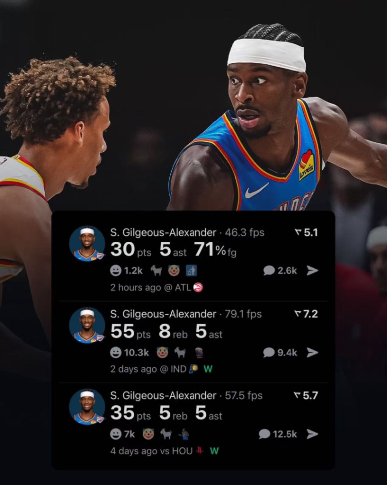 NBA常規賽雷霆117-110戰勝老鷹,本場比賽雷霆球員Shai Gilgeous Alexander投籃17中12,砍下30分4籃板5助攻。這位MVP已經連續三場比賽得分30+