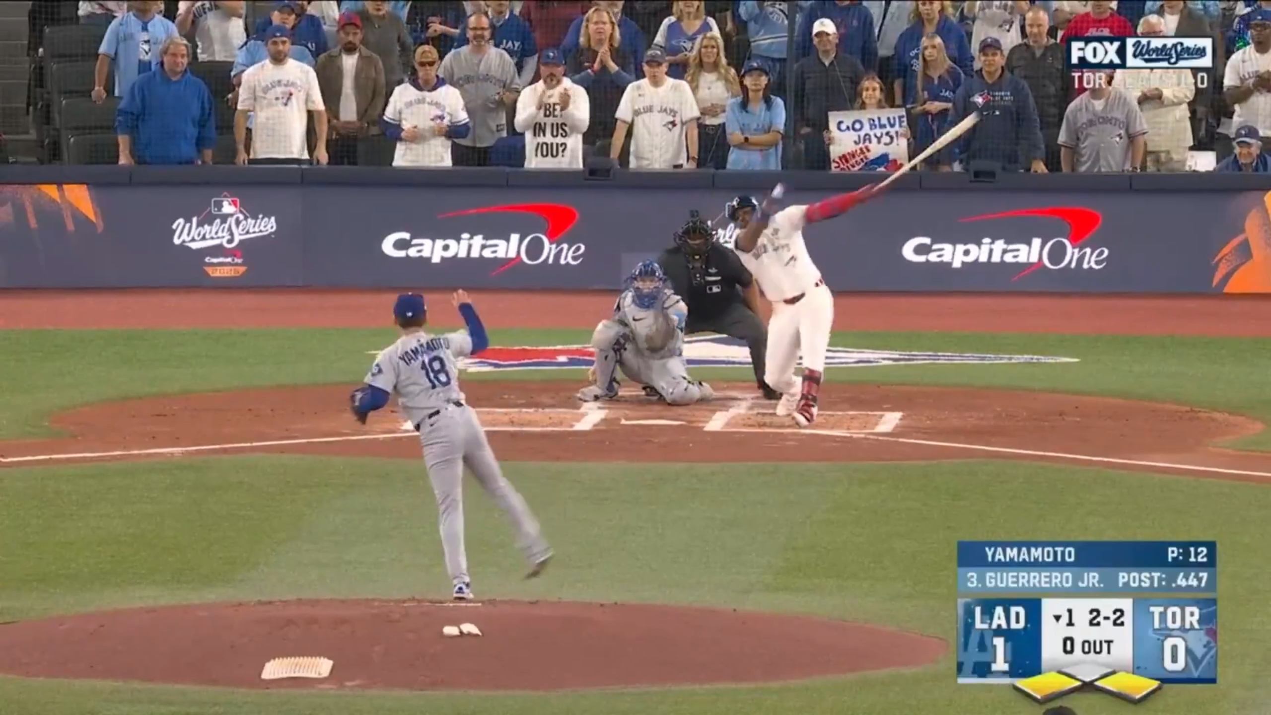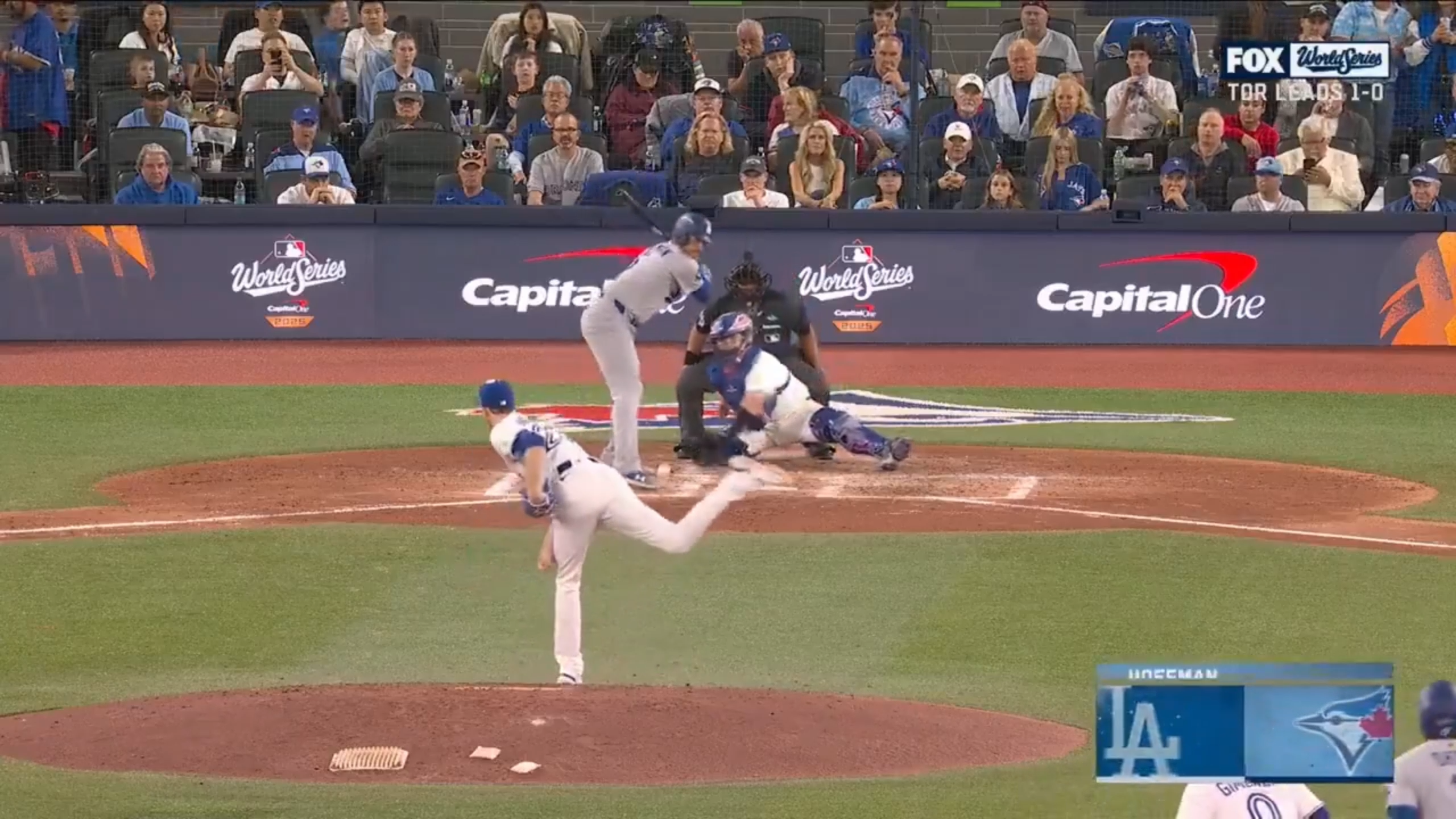 世界大賽第二戰,道奇在第一局就打出兩隻串聯安打先馳得點,但藍鳥王牌Gausman立即回穩,連續解決17位道奇打者。直到第七局才被Will Smith與Max Muncy單局兩隻陽春炮突破比分退場。八局上道奇繼續追加兩分保險分,同時山本由伸僅用105球僅被敲4隻安打飈出8K完投九局,在第三局被Kirk高飛犧牲打失唯一一分。最終道奇5比1戰勝藍鳥,世界大賽兩隊1比1戰平,第三戰將回到道奇主場。