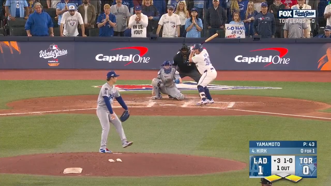三局下山本由伸對Springer投出觸身球後,VGJ敲出一隻直擊全壘打墻的深遠一壘安打,隨後Kirk把握機會打出中外野高飛犧牲打追平比數。三局打完兩隊1:1平手。