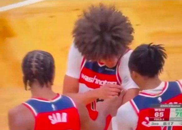 在一次防守Jaylen Brown的過程中,Kyshawn George被沉肩突破的Jaylen Brown撞到,隨後他向隊友展示了自己內襯衫上的黑色印記,那正是Jaylen Brown頭頂撞到的部位。