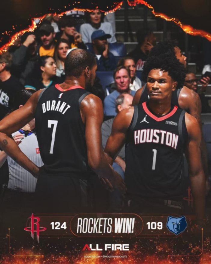 Amen Thompson28分10籃板7助攻2抄截;Alperen Sengun20分16籃板7助攻;Jabari Smith Jr16分;Kevin Durant11分4籃板5助攻。灰熊方面,Ja Morant17分5籃板8助攻;Cam Spencer19分;Jaren Jackson Jr9分6籃板5阻攻。