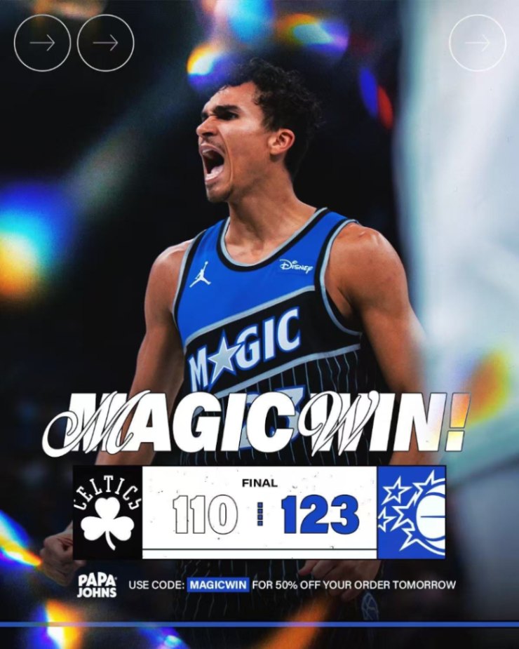 NBA杯東部B組魔術對陣塞爾蒂克。首節魔術在中段轟出一波20-4的攻勢,一舉建立兩位數領先。次節塞爾蒂克一度將分差迫近至4分,但魔術及時回應,守住優勢。下半場開始綠軍多次將分差縮小至1分,但魔術始終牢牢壓制,未能讓對手反超。第四節塞爾蒂克完成反超後突然進攻斷電,魔術憑藉一波14-2的得分高潮鎖定勝局。最終魔術123-110戰勝塞爾蒂克。