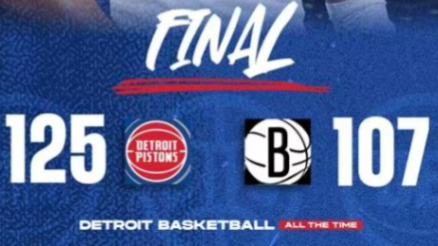 NBA杯活塞125-107戰勝籃網。本場比賽,Cade Cunningham和Jalen Duren兩人32中24,合砍64分,12籃板,10助攻,4抄截。