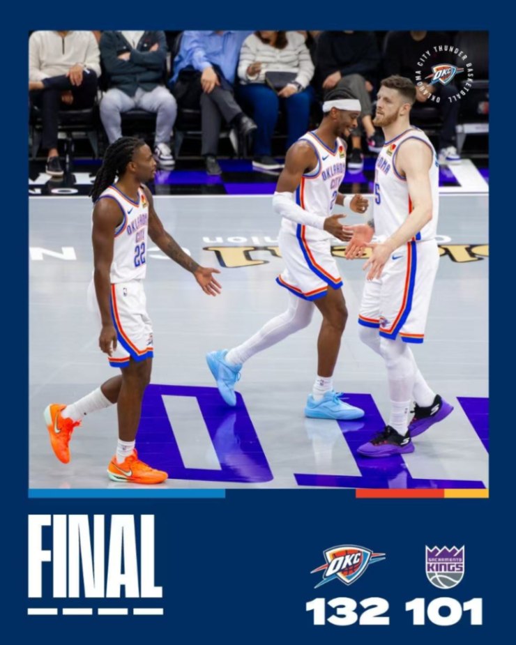 Isaiah Hartenstein31分19籃板;SGA30分3助攻;Ajay Mitchell18分5籃板10助攻。國王方面,Russell Westbrook24分6籃板9助攻;Demar DeRozan18分5籃板,Drew Eubanks16分。