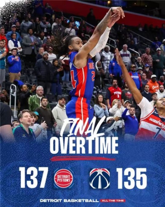 Cade Cunningham46分12籃板11助攻5抄截;Daniss Jenkins24分8籃板4抄截;Jalen Duren19分14籃板3助攻;Duncan Robinson13分。巫師方面,CJ McCollum42分6籃板4助攻;Alexandre Sarr15分15籃板;Cam Whitemore20分。