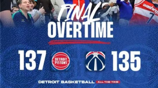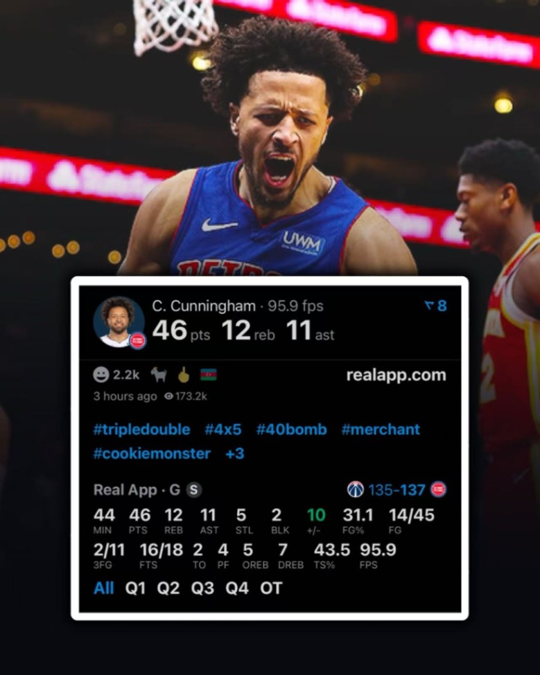 NBA常規賽活塞主場137-135險勝巫師。本場比賽,Cade Cuningham出戰45分鐘,45投14中,罰球18中16,三分球11投2中。得到46分12籃板11助攻5抄截2阻攻。