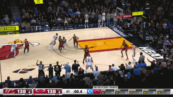 加時賽最後6秒,騎士三分不中但搶下進攻籃板,Donovan Mitchell在底角三分線轉身命中高難度三分,將比分扳成138平,時間僅剩0.4秒。