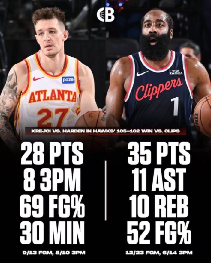 亞特蘭大老鷹隊神射手Vit Krejci在105-102戰勝洛杉磯快艇的比賽中,與James Harden的三雙數據展開對飆並率老鷹隊客場取勝!