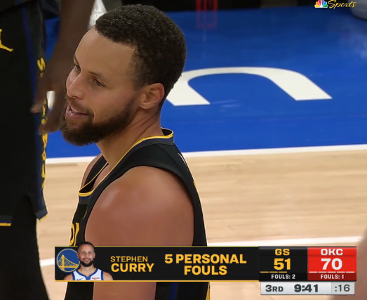 第三節比賽還剩9分41秒時,Curry就已領到個人第5次犯規。