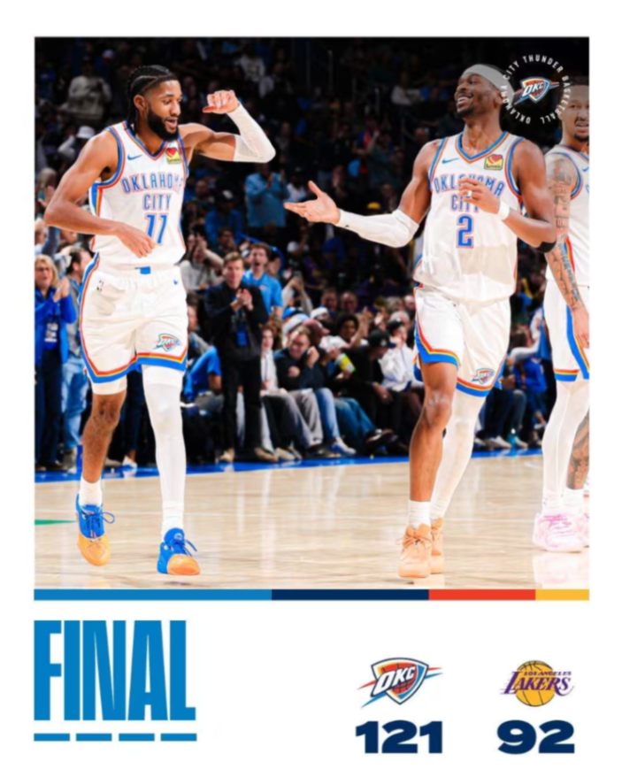 NBA例行賽雷霆主場對陣湖人。首節雷霆迅速進入狀態,單節淨勝12分確立優勢。次節雷霆轟出40-20攻擊波,半場領先達32分。第三節雷霆繼續擴大分差,三節領先36分鎖定勝局。末節比賽進入垃圾時間,雙方替補完成賽事。最終雷霆主場121-92大勝湖人。