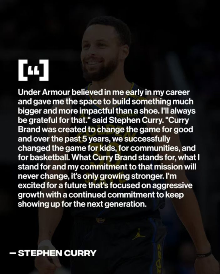 據多方媒體報道,Stephen Curry已經和Under Armour分道揚鑣。隨後Curry發表聲明:“在我職業生涯的早期階段,Under Armour就相信我,並給我空間去打造一些比球鞋更有意義的東西,對此我心存感激。Curry Brand的創立是為了徹底改變這項運動,在過去五年中,我們已經成功的為孩子們,社區和籃球運動帶來了改變。Curry Brand品牌所代表的理念,以及我秉持的信念以及對使命的承諾永遠不會改變,只會越來越堅定。我對未來充滿期待,未來我們將專注於積極的成長,同時致力於為下一代做出表率。”