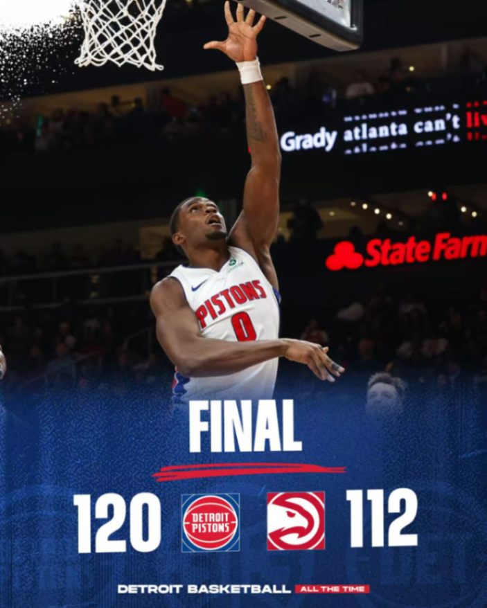 Cade Cunningham25分6籃板10助攻;Jalen Duren24分8籃板3助攻;Duncan Robinson14分3籃板3助攻。老鷹方面,Jalen Johnson25分8籃板9助攻;Onyeka Okongwu21分1籃板3助攻;Nickeil Alexander-Walker24分3籃板3助攻。