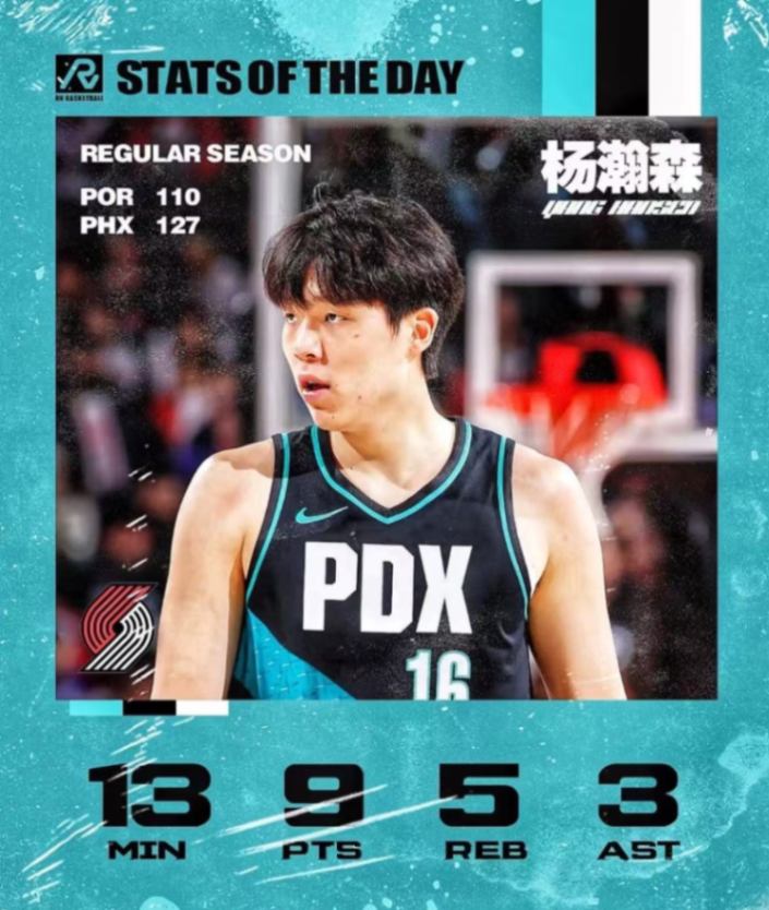 NBA例行賽拓荒者主場110-112不敵太陽,中國球員楊瀚森出場13分鐘,投籃7中4得到9分5籃板3助攻1阻攻。