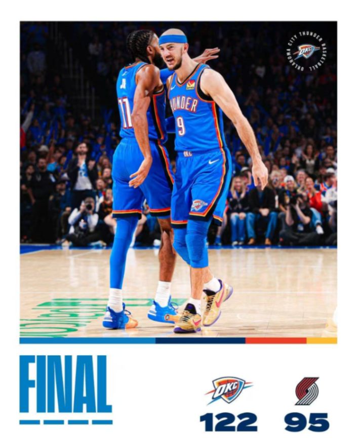 Shai Gilgeous-Alexander37分5籃板7助攻;Ajay Mitchell20分1籃板5助攻;Isaiah Joe10分2籃板。拓荒者方面,楊瀚森8分4籃板3助攻;Donovan Clingan8分8籃板2阻攻;Deni Avdija11分5籃板1助攻。